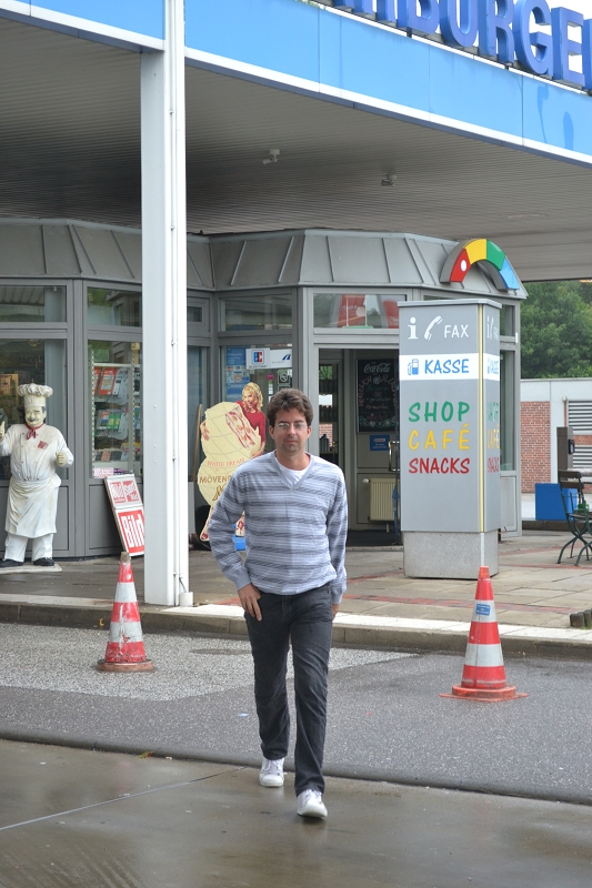 Nach einem schnellen und kurzen Frühstück (mit frischen Kaffee, extra von Roger eingekauft) und einem morgendlichen Spaziergang mit Fangio verabschieden wir uns von unserem ersten Schlafplatz und rollen weiter in Richtung Flensburg. Kurz vor Hamburg (Harburger Berge) braucht unser Tank die zweite Füllung. Wir haben jetzt schon ca. 825km Fahrt hinter uns. Das Wetter ist noch immer leicht regnerisch und bewölkt. Als wir auf der Autobahn Hamburg passieren bestaunen wir links und rechts den grossen Hafen und schiessen die ersten Ferienfotos.