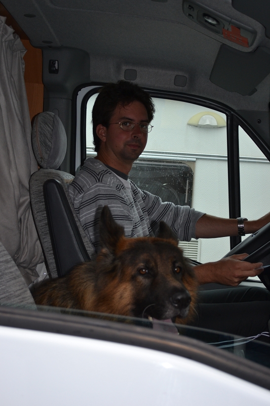 Kassel haben wir schon längst hinter uns gelassen. Da es langsam spät wird und sowohl der Hund, als auch wir einen kleinen Hunger verspüren, beschliessen wir, die Nacht über auf einer Raststätte zu verbringen. Kurz vor Hildesheim (vor Hannover) finden wir die passende Stelle. Inzwischen ist der Regen definitiv eingetroffen. So wird die Regenmontur gesattelt und los geht es zum Abendspaziergang mit dem Vierbeiner. Hier gibt es einiges zu beschnuppern und zu bestaunen. Nachdem wir alle gut verlüftet sind und die Beine gelockert haben, stellt sich Sabine hinter den Herd und Roger bereitet das Nachtlager vor. Nach den Tomatenspaghettis ist Nachtruhe angesagt.