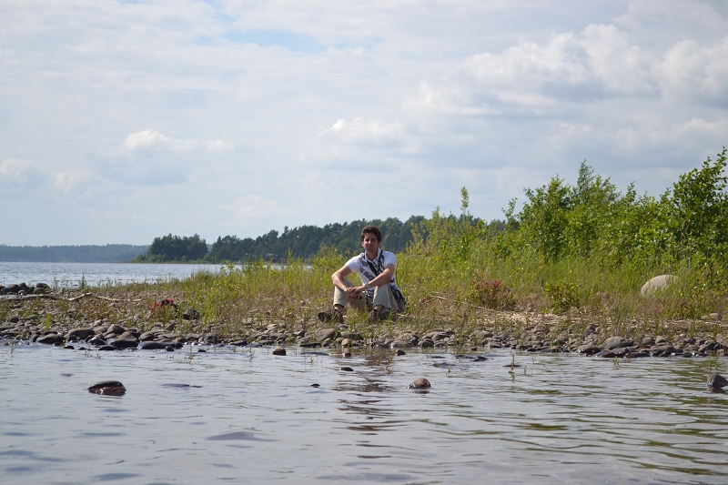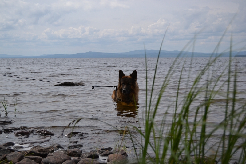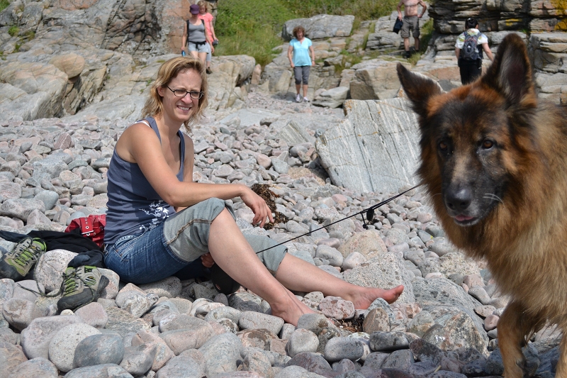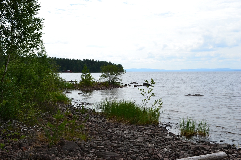 Wie könnte es auch anders sein, jeder begehbare Fleck zum See hin ist schon an Privatbesitzer vergeben. Dies soll uns jedoch nicht davon abhalten eine kleine Bucht für eine Rast und einen Badeort für Fangio zu finden. Wir lassen die Bikes hinter einem Baum stehen und schleichen uns durch die Heidelbeerbüsche bis hinunter ans kühle Nass. Schnell ist die kleine, mit roten Kupfersteinen übersähte Bucht gefunden. Die Zweibeiner setzen sich auf die Steine und geniessen die Sonne und die Ruhe hier und der Vierbeiner gönnt sich nach dem langen Lauf das wohlverdiente Bad und kühlt sich ab für den bevorstehenden Aufstieg zum Womo.