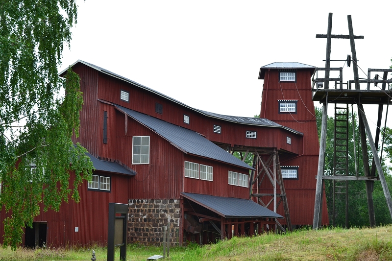 Unsere nachfolgende Fahrt führt dann ins "Blaue" resp. Grüne in Richtung Lesjöfors. (Sjö bedeutet übrigens See.) Auf der Fahrt dorthin kommen wir an der Langbans Gruvy vorbei, wo natürlich ein obligatorischer Halt zu machen ist. Die Langbans Gruvy ist ein Überbleibsel des früheren Eisentagbaus. Wir sehen einige stillgelegte Minen, die nicht mehr begehbar sind und ein Dorf im schwedisch roten Landhausstil, das zur damaligen Zeit für die Minenarbeiter erbaut wurde. Nebst der ultra kleinen Kantine sind die enorm grossen Türme zu sehen, mit denen das Eisen zu Tage gebracht wurde.