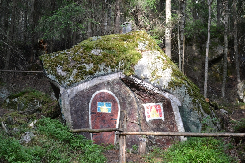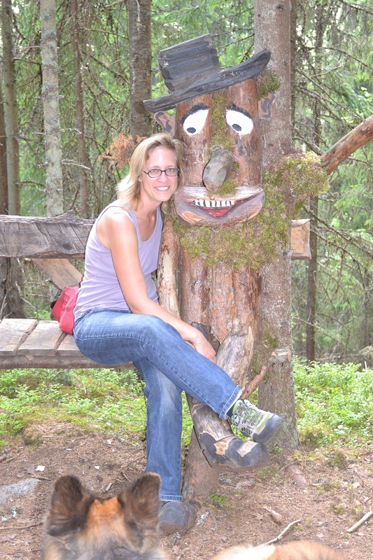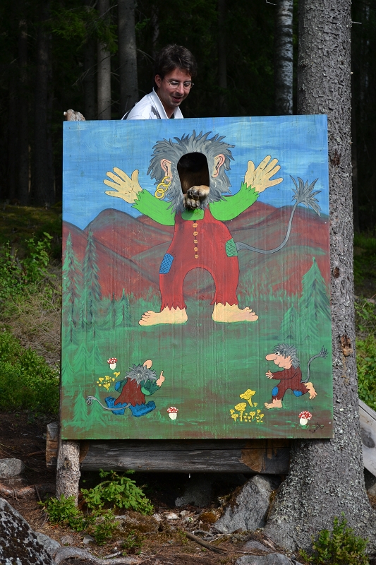 Alsdann geht unsere Reise – diesmal in Form eines Fussmarsches – weiter entlang dem Trollepfad. Dieser führt uns 3.2 km tief in den Wald hinein und den Hang hinauf. Der Weg ist märchenhaft gestaltet. Wir werden von unzähligen Trollen und Tieren geführt, so dass man sich in eine andere Welt versetzt glaubt. Hier gucken ein paar freche Kerlchen hinter einem Häuschen hervor, dort späht eine Eule vom Ast herunter und hinter dem nächsten Baum singt der Trollchor ein Ständchen....