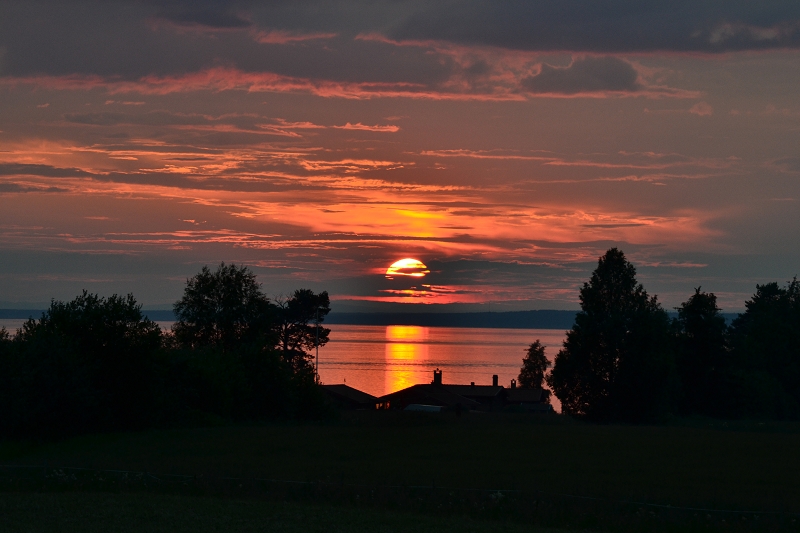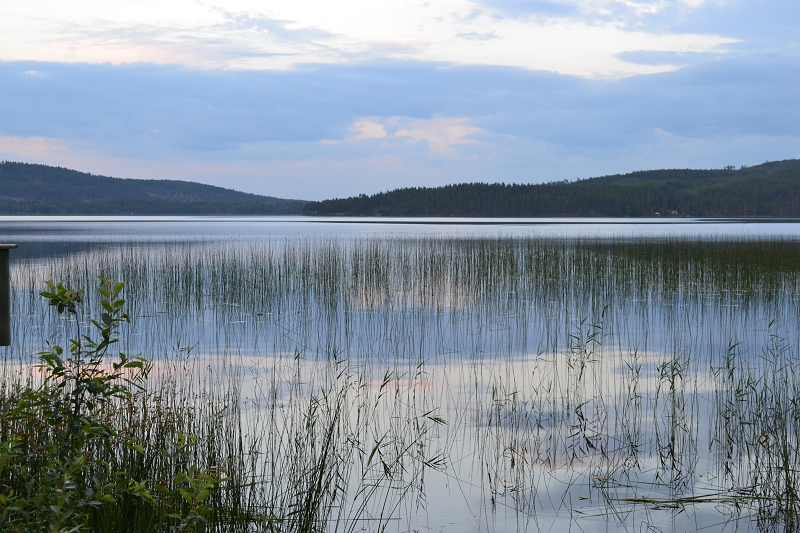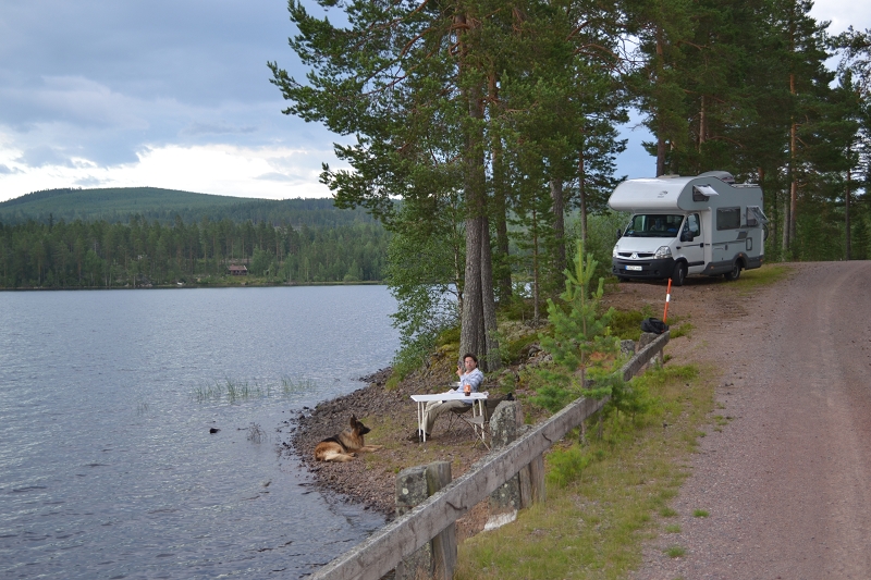 Erst spät am Abend gelingt es uns eine Stelle am Wasser zu finden, wo wir ungestört verweilen können. Nicht ganz ideal hier, aber ruhig ist es auf jeden Fall. Ein kleines Stück von uns entfernt hinter einem Friedhof und einem grossen Parkplatz befindet sich die Papierfabrik von Billingfors. Das einzige was uns hier noch stören könnte sind die parkenden und übernachtenden LKW-Fahrer, die darauf warten, am nächsten Morgen ihre Ware anliefern zu können. Wir stellen unser Womo so hin, dass wir direkt am See sitzen und vom Rest abgeschottet sind. So passt es wunderbar und wir kriegen vom ganzen Rummel nichts mit und haben unsere Ruhe.